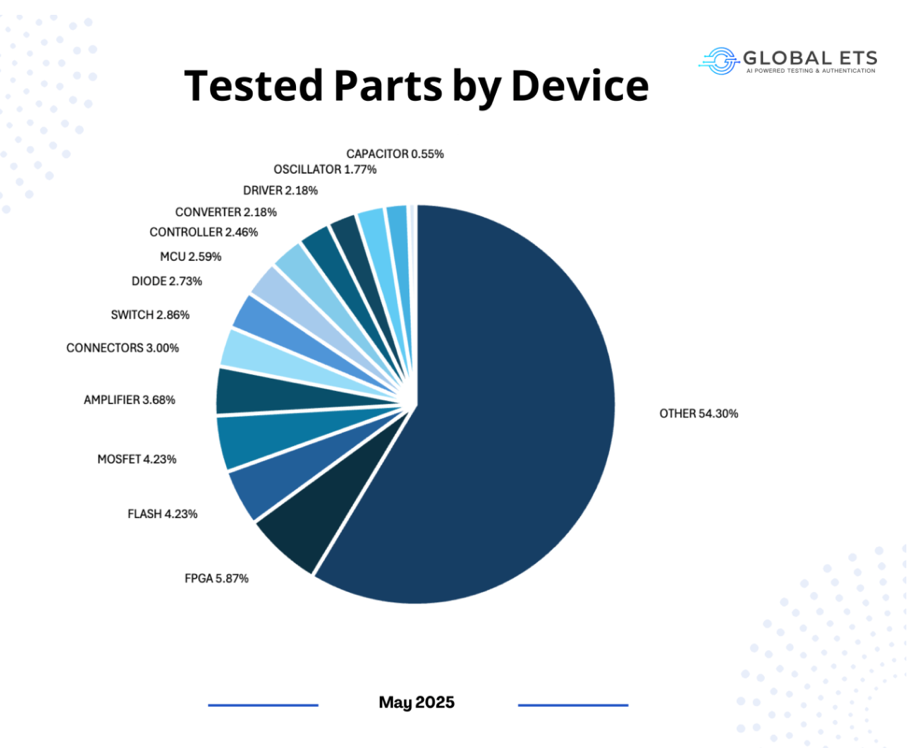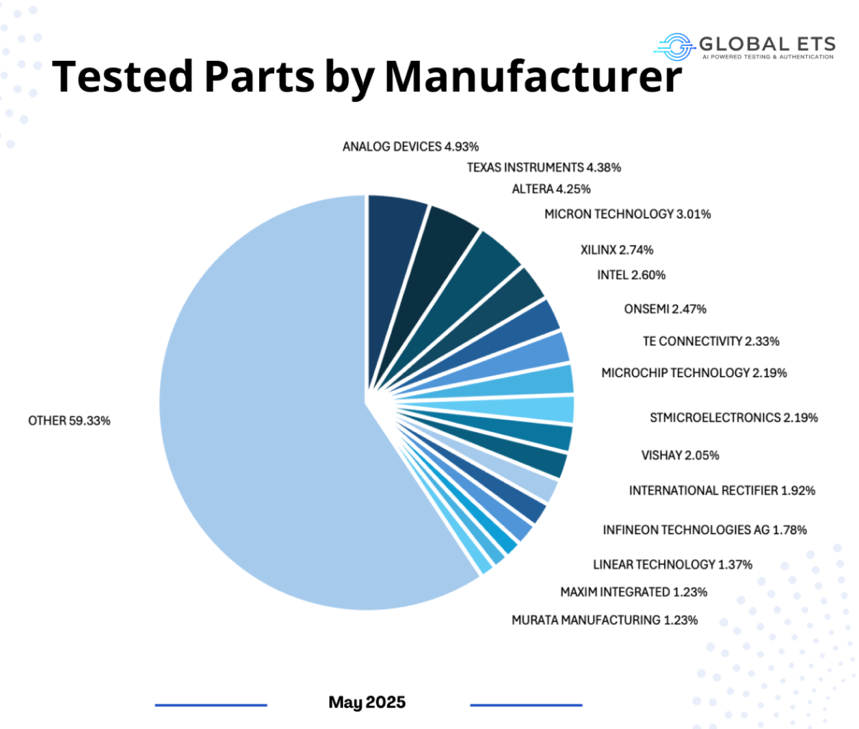 Xilinx’s share dropped from 4.50% in April to 2.74% in May, suggesting a shift in market dynamics or reduced testing volume. These components, critical to high-stakes applications, showed vulnerabilities, with May’s 6.17% failure rate indicating that over 600 of the 10,000+ tested parts failed to meet standards, per Global ETS’ analysis.